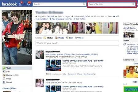 In the image, the standard box that lets you search Facebook is visible at the top of the page, but just to the right of it is another search box reading "Search the Web."