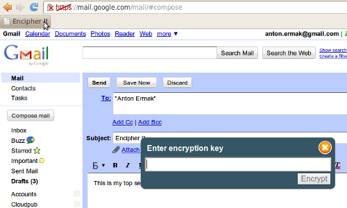 "Encipher It" One of the best and easiest AES Text encryptor for Google Mail or anything else. It Provide more secure PBKDF2 (Password-Based Key Derivation Function) key generation. It use Advanced Encryption Standard to protect your data. All encoding/decoding is performed locally in your browser.