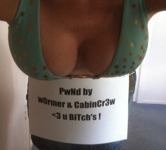 The snap posted by 30-year-old Ochoa shows a girl in a bikini top from the neck down, with a printed message pinned to her skirt reading: "PwNd by w0rmer & CabinCr3w"