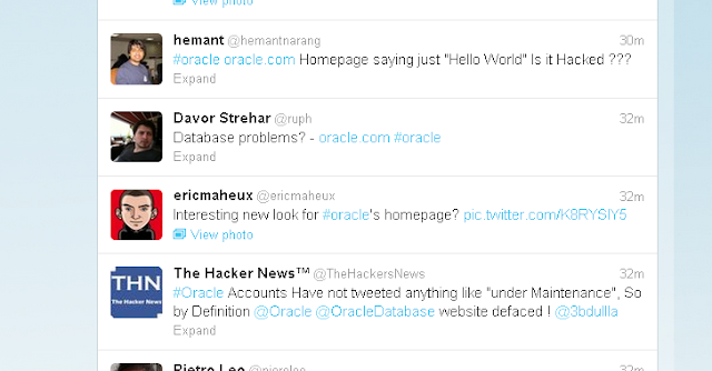 I tried to open it via mobile, it redirect me to mobile version at Oracle.mobi, Yes its working fine as normal. Then we start moving on Twitter to find out whats going on, Lots of people tweeting about this and everyone seems to be confused that IS IT A HACK ? or the site is Under Maintenance ?