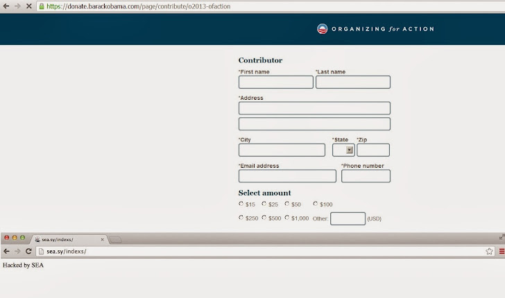 Last night, Syrian Electronic Army (SEA) hacked into Obama's donation website donate.barackobama.com, which was temporarily redirected to the website of the hacking group (sea.sy/indexs/) with a short message: "Hacked by SEA".