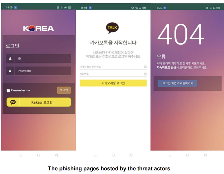 Post installation, the application requests for a wide range of permissions before opening a phishing site that's designed to resemble the login pages of popular apps such as Facebook, Instagram, Google, and Kakao Talk. Users who attempt to sign in, however, are greeted by a HTTP 404 Not Found message, but in reality, have their credentials stolen and exfiltrated to a remote command-and-control (C2) server.