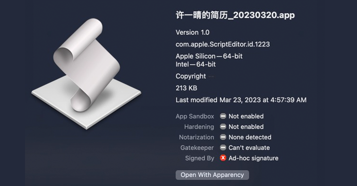 Xu Yiqing's Resume_20230320.app, one of the artifacts discovered by SentinelOne, employs a run-only AppleScript to reach out to a remote server and download a Geacon payload. It's compatible with both Apple silicon and Intel architectures.